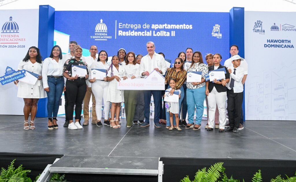 Santo Domingo. -En un acto encabezado por el presidente de la República, Luis Abinader; la ministra de la Mujer, Mayra Jiménez; y el ministro de Viviendas y Edificaciones, Carlos Bonilla, el Ministerio de la Mujer entregó RD$ 6,940,000.00 millones de pesos en Bono Mujer, en el marco del Plan Nacional de Viviendas Familia Feliz, en el proyecto Residencial Lolita II, en Hato Nuevo de Manoguayabo, en Santo Domingo Oeste.