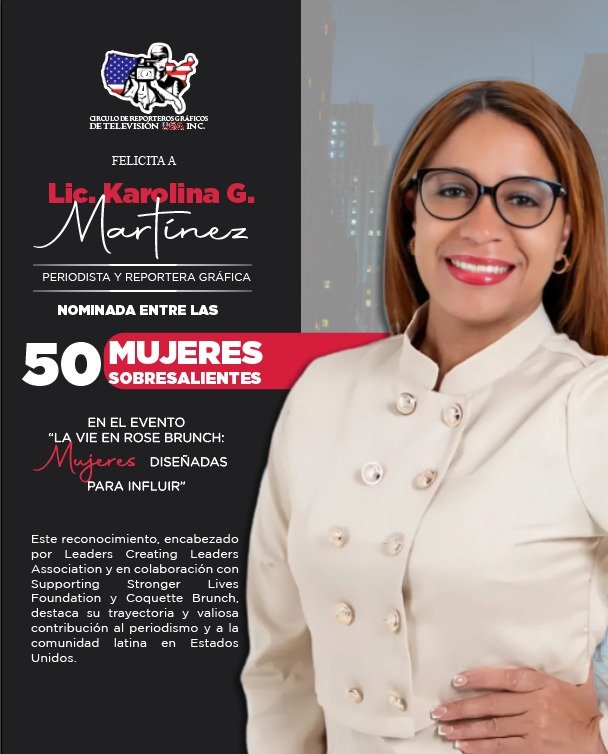 Santo Domingo.- La destacada periodista y productora audiovisual dominicana Karolina Martínez Medina ha sido seleccionada como una de las 50 mujeres sobresalientes de la diáspora latina en el evento “La Vie en Rose Brunch: Mujeres Diseñadas para Influir 2026”, en la categoría de Periodismo. Este reconocimiento pone de relieve no solo su trayectoria profesional, sino también su compromiso con la representación femenina en los medios de comunicación.